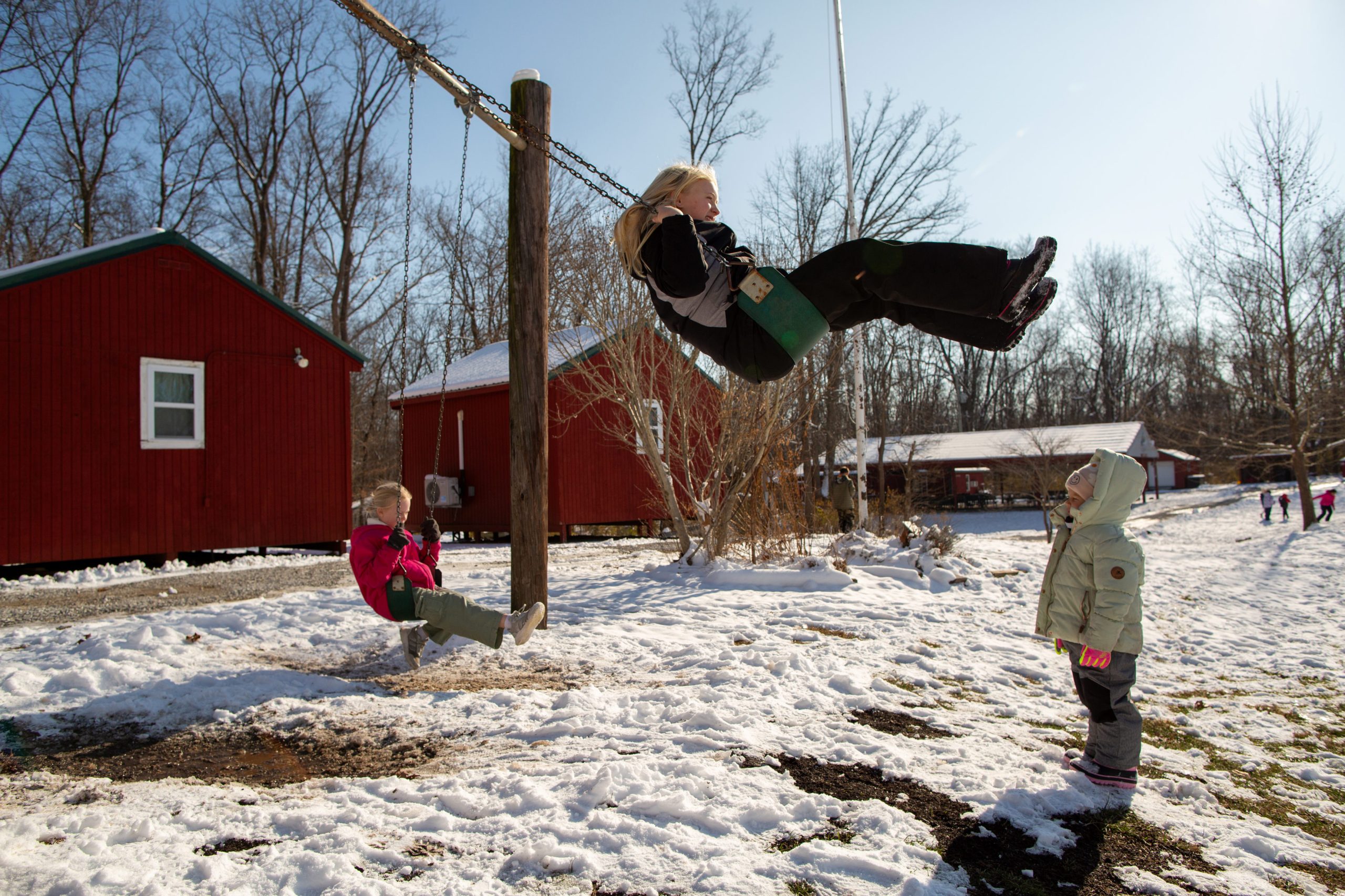 Students go sledding in the morning at Nature’s Gift Microschool at Nameless Creek in Greenfield, Ind., on Dec. 5, 2025. Credit: Zach Dobson for The Hechinger Report