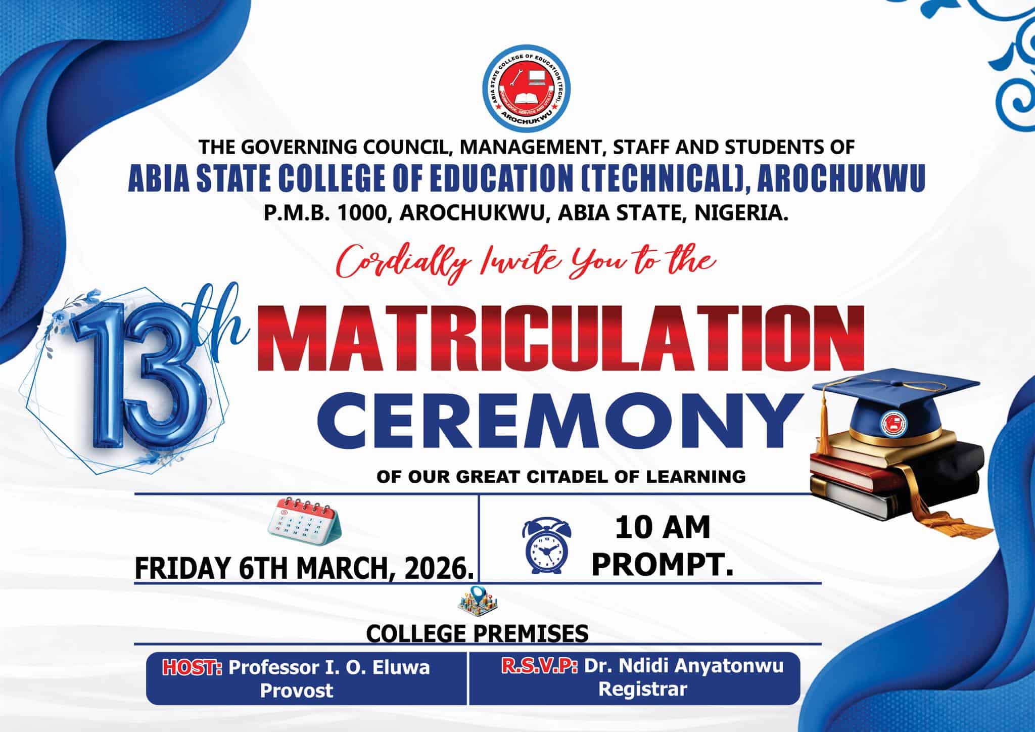 ASCETA 13th matriculation holds Friday, 6 March 2026, 10.00 am timely, at the college properties in Arochukwu.