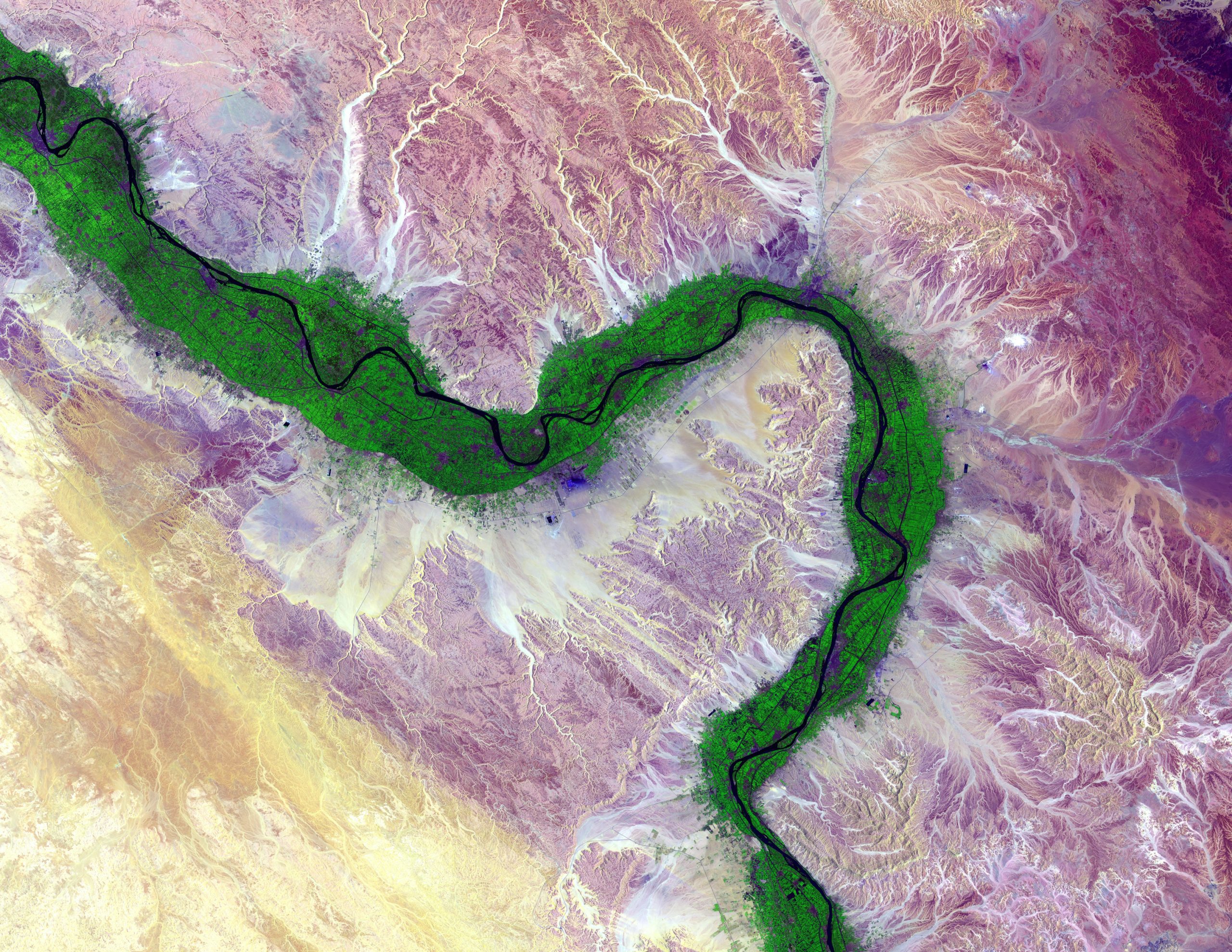 River Nile from space eclipsed by green farmland and surrounded by desert The River Nile is a delta formed in lower Egypt draining into the Mediterranean